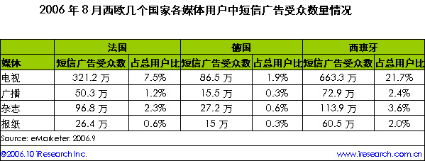 iResearch艾瑞市場咨詢根據eMarketer資料整理顯示,短信廣告在西歐國家大行其道,成百上千萬的移動用戶訂閱了廣告短信。西歐各國不同媒體訂閱廣告短信的用戶數不盡相同。總體上來看,西班牙的短信廣告受眾最多,電視用戶中有21.7%人訂閱了短信廣告,數量達663.3萬。相比之下,法國電視用戶中的短信廣告受眾只有西班牙的1/2,德國則更少。