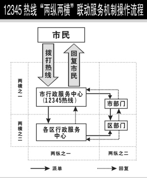 為了保證熱線順利開(kāi)通提供優(yōu)質(zhì)服務(wù),有關(guān)方面還建立了“兩縱兩橫”聯(lián)動(dòng)服務(wù)機(jī)制!皟煽v”即市行政服務(wù)中心與各區(qū)行政服務(wù)中心之間的縱向聯(lián)系,市級(jí)熱線成員單位與區(qū)級(jí)熱線成員單位之間的縱向聯(lián)系;“兩橫”即市行政服務(wù)中心與市級(jí)熱線成員單位的橫向聯(lián)系,各區(qū)行政服務(wù)中心與區(qū)級(jí)熱線成員單位之間的橫向聯(lián)系。