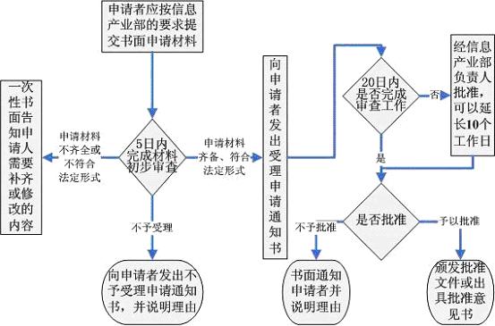 信息產(chǎn)業(yè)部或者省、自治區(qū)、直轄市通信管理局應(yīng)當(dāng)自發(fā)出受理申請(qǐng)通知書之日起20個(gè)工作日內(nèi)完成審查工作,作出批準(zhǔn)或不予批準(zhǔn)的決定。20個(gè)工作日內(nèi)不能做出決定的,經(jīng)信息產(chǎn)業(yè)部或者省、自治區(qū)、直轄市通信管理局負(fù)責(zé)人批準(zhǔn),可以延長(zhǎng)10個(gè)工作日,并將延長(zhǎng)期限的理由告知申請(qǐng)人。予以批準(zhǔn)的,出具正式批準(zhǔn)文件;不予批準(zhǔn)的,書面通知申請(qǐng)人并說(shuō)明理由。