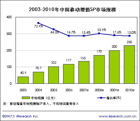 中國移動增值服務(wù)從其產(chǎn)生開始,便因其服務(wù)的多樣性和個性化而受到廣大用戶的歡迎,市場規(guī)模增長非常迅速。大眾移動增值業(yè)務(wù)市場是一塊增長快速、極具吸引力的沃土,以短信為代表的移動增值業(yè)務(wù)正在為移動運(yùn)營商和服務(wù)、服務(wù)提供商(SP)創(chuàng)造更多的收入,而WAP/MMS/Java等2.5G業(yè)務(wù)也將從2007年開始進(jìn)入高速發(fā)展階段。