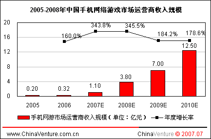 手機(jī)網(wǎng)游業(yè)務(wù)經(jīng)過近幾年培育,市場(chǎng)規(guī)模逐步擴(kuò)大。隨著用戶認(rèn)知度和普及率逐步提高,未來將成為游戲產(chǎn)業(yè)新的增長(zhǎng)點(diǎn)。代表手機(jī)游戲未來發(fā)展方向的手機(jī)網(wǎng)游市場(chǎng)必將在2008年和2009年開始獲得風(fēng)險(xiǎn)投資商的廣泛關(guān)注。