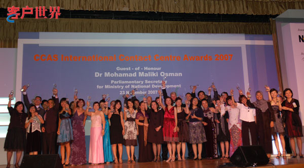 2007年11月23日,新加坡。2007年度國際呼叫中心大獎頒獎典禮今天在新加坡Ritz Carlton酒店隆重舉行;繼2006年首度接軌亞太地區(qū)最佳呼叫中心評選活動之后,中國呼叫中心行業(yè)協(xié)會CNCCA再次組團(tuán)出訪獅城新加坡。在本年度國際最佳呼叫中心評選的角逐當(dāng)中,來自中國的中國電信深圳分公司10000號客戶服務(wù)中心、中國移動通信集團(tuán)廣東有限公司客戶服務(wù)(廣州)中心、中國工商銀行電子銀行中心攜手榮膺最佳呼叫中心大獎。