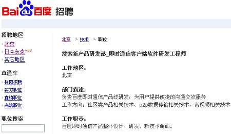 百度有意推IM產(chǎn)品的傳聞?dòng)蓙?lái)已久,不過(guò)該傳聞一直未得到官方證實(shí)。但在其官網(wǎng)最新公布的招聘頁(yè)面中,百度已向外界羅列出即時(shí)通信客戶端軟件研發(fā)工程師(搜索新產(chǎn)品研發(fā)部)、即時(shí)通信軟件產(chǎn)品經(jīng)理(客戶端軟件業(yè)務(wù)部)等職位,上述工作地點(diǎn)均在北京,可見百度的IM戰(zhàn)略布局已具雛形。
