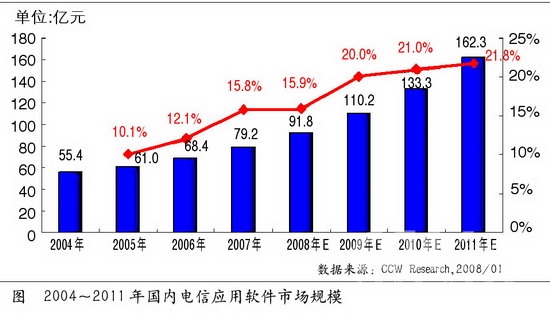從計世資訊相關(guān)報告來看,2008年電信應(yīng)用軟件市場將出現(xiàn)以下特點: