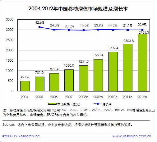 根據(jù)iResearch艾瑞咨詢即將推出的《2008-2009年中國移動互聯(lián)網(wǎng)行業(yè)發(fā)展報告》統(tǒng)計,2008年中國移動增值市場規(guī)模達1251.3億人民幣(約合183.2億美元),相比2007年的1050億人民幣年同比僅增長19.2%,相比2007年增速放緩。(中國移動增值市場規(guī)模定義為用戶為各項移動增值業(yè)務(wù)付費總和)