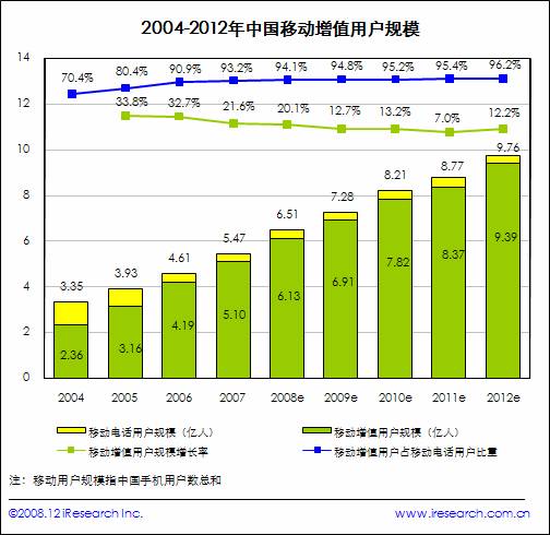 艾瑞咨詢根據(jù)工信部統(tǒng)計的中國移動電話用戶數(shù)量并結(jié)合行業(yè)研究發(fā)現(xiàn),2008年中國移動電話用戶數(shù)將達6.5億,同比增長19.0%,而2008年中國移動增值用戶規(guī)模預計將達6.13億人,相比2007年的5.10億同比增長20.2%,占中國移動電話用戶規(guī)模的94.1%。預計到2009年中國移動增值用戶規(guī)模將達到6.91億人,而到2012年將突破9億人。