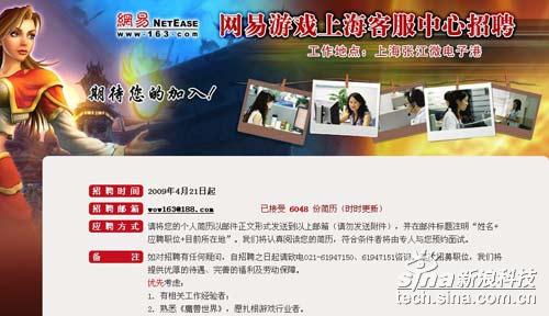 網(wǎng)易表示,招聘將從2009年4月21日起正式開(kāi)始,將提供優(yōu)厚的待遇、完善的福利及勞動(dòng)保障。截至21日0時(shí),該頁(yè)面顯示網(wǎng)易已接收到6048份簡(jiǎn)歷。