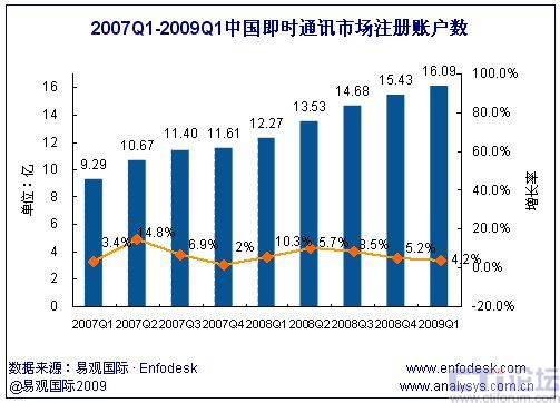 2009年第1季度中國即時通訊市場累計(jì)注冊賬戶數(shù)達(dá)16.1億