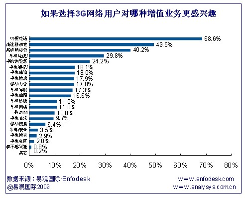 據(jù)易觀Enfodesk《中國3G市場用戶調(diào)研報(bào)告2009》研究發(fā)現(xiàn),可視電話成為最受用戶歡迎的增值業(yè)務(wù),除此之外,高速移動(dòng)寬帶業(yè)務(wù)和高清晰語音受用戶選擇比例也較高,分別達(dá)到49.5%和40.2%。與此相反的是,手機(jī)社區(qū)、手機(jī)博客和殺毒/安全業(yè)務(wù)受歡迎程度最小。