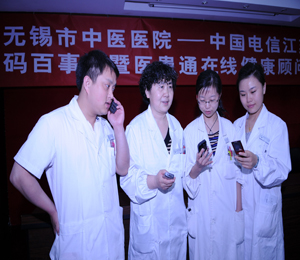 5月25日,江蘇省無錫市中醫(yī)醫(yī)院18位專家級醫(yī)師接受了中國電信江蘇公司的聘請,成為無錫首批電話在線的健康顧問。全省電信用戶只要撥打號碼百事通118114,即可得到在線醫(yī)療、健康專業(yè)指導。118114健康平臺還能為出院病人提供康復指導、動態(tài)跟蹤、復診提醒等健康管理服務。通過這一形式,能盡快實現(xiàn)一個醫(yī)前、醫(yī)中、醫(yī)后服務鏈。圖為無錫市中醫(yī)醫(yī)院的健康顧問們在為患者集體電話會診。