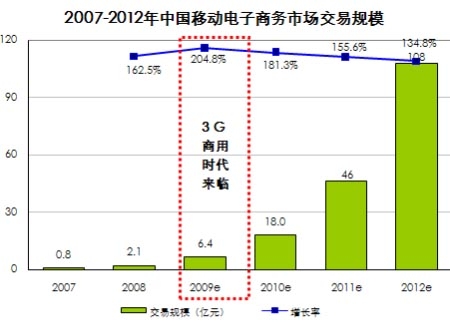 根據(jù)艾瑞咨詢即將發(fā)布的《2008-2009年中國移動(dòng)電子商務(wù)行業(yè)發(fā)展報(bào)告》數(shù)據(jù)表明,08年中國移動(dòng)電子商務(wù)市場交易規(guī)模為2.1億元,09年隨著3G商用時(shí)代到來,以及無線與傳統(tǒng)電子商務(wù)企業(yè)的紛紛試水,預(yù)計(jì)交易規(guī)模將達(dá)6.4億,同比增長約205%。艾瑞預(yù)計(jì)2012年移動(dòng)電子商務(wù)交易規(guī)模將達(dá)到108億元,發(fā)展?jié)摿薮蟆?br />