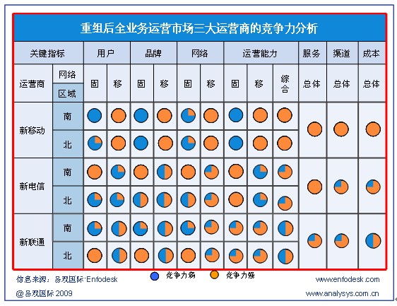 盡管產(chǎn)業(yè)鏈完備程度相差較為明顯,但運(yùn)營商各自業(yè)務(wù)與用戶服務(wù)運(yùn)營能力對3G時(shí)常的發(fā)展影響也至關(guān)重要,根據(jù)易觀國際Enfodesk發(fā)布的《國內(nèi)運(yùn)營商3G業(yè)務(wù)發(fā)展策略研究系列—中國3G市場現(xiàn)狀與發(fā)展策略概述》報(bào)告顯示,在發(fā)展3G的過程中,三大運(yùn)營商各自有一定的優(yōu)劣勢: