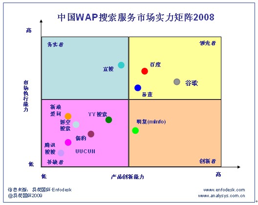 CTI論壇(ctiforum)06月16日消息: 據(jù)易觀國際Enfodesk近期發(fā)布《中國移動搜索市場實力矩陣專題報告2009》顯示, 對于WAP搜索服務市場,2008年移動搜索廠商對于用戶的爭奪和地域、渠道的卡位競爭越發(fā)激烈,用戶市場格局已趨于清晰,領先者和市場補缺者兩極分化格局明顯。而對于該服務的商業(yè)模式仍處于繼續(xù)摸索階段,但較早嘗試市場規(guī)模的廠商已稍有成效,而其他廠商也逐漸重視商業(yè)模式的構建。