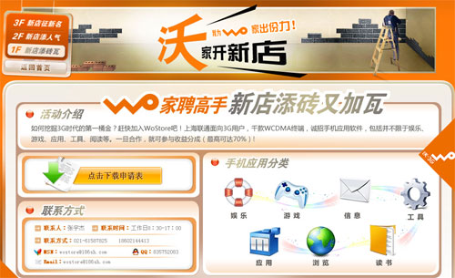上海聯(lián)通在該網(wǎng)站特別設(shè)定“我家開新店”版塊,為新店征名,同時尋求軟件開發(fā)伙伴,并稱包括不限于娛樂、游戲、應(yīng)用、工具、閱讀等類別,一旦合作就可參與收益分成,最高可達(dá)70%。