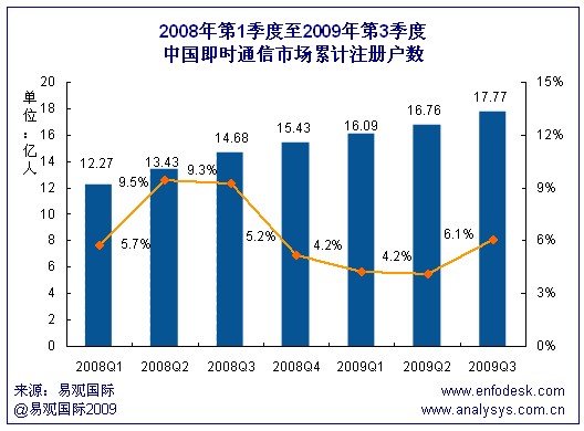 根據(jù)易觀(guān)國(guó)際Enfodesk產(chǎn)業(yè)數(shù)據(jù)庫(kù)即將發(fā)布的《2009年第3季度中國(guó)即時(shí)通信市場(chǎng)季度監(jiān)測(cè)》數(shù)據(jù)顯示,2009年第3季度中國(guó)即時(shí)通訊市場(chǎng)累計(jì)注冊(cè)賬戶(hù)數(shù)達(dá)到17.77億,環(huán)比增長(zhǎng)6.1%,同比增長(zhǎng)21%。