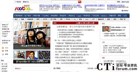 CTI論壇(ctiforum)1月11日消息(記者 張塵):近日,記者獲悉,原天極傳媒集團(tuán)副總裁、資深媒體人士范鋒正式宣布創(chuàng)業(yè),同時,其所創(chuàng)辦的Web2.0媒體速途網(wǎng)(www.sootoo.com)于今日正式上線。在經(jīng)過近9個月的低調(diào)測試之后,定位于“中國互聯(lián)網(wǎng)行業(yè)媒體和在線服務(wù)平臺”的速途網(wǎng)今天以全新版式亮相。