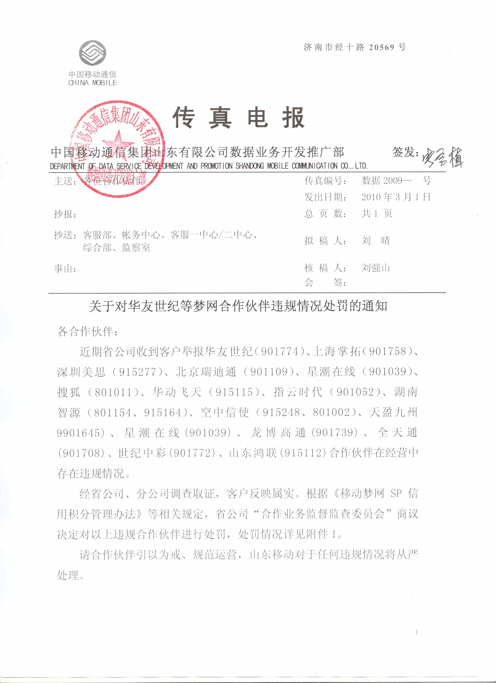 附件是華友世紀(jì)、上海掌拓、深圳美思等16家夢(mèng)網(wǎng)合作業(yè)務(wù)違規(guī)行為的處罰決定。