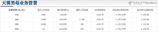 目前電信推出的黑莓手機套餐分為四類,一類為天翼黑莓簡裝版,價格為每月189元,包括60MB國內(nèi)上網(wǎng)流量,100分鐘國內(nèi)語音通話時長;第二類是天翼黑莓標準版套餐,價格為289元,包括100MB國內(nèi)上網(wǎng)流量,0.5MB國際上網(wǎng)流量,400分鐘國內(nèi)語音通話時長;第三類和第四類為天翼尊享版套餐包括389元和589元兩種資費,前者包括500MB國內(nèi)上網(wǎng)流量,1MB國際上網(wǎng)流量,600分鐘國內(nèi)語音通話時長;后者包括1GB國內(nèi)上網(wǎng)流量,2MB國際上網(wǎng)流量,1000分鐘國內(nèi)語音通話時長。