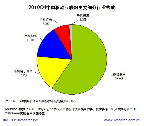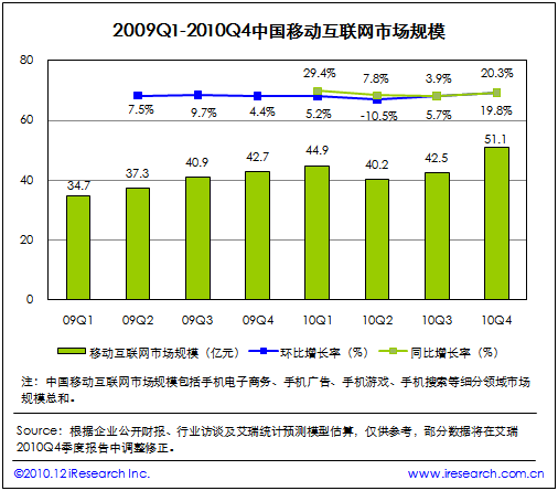 根據(jù)艾瑞咨詢即將發(fā)布的2010年第四季度中國移動互聯(lián)網(wǎng)市場監(jiān)測數(shù)據(jù)顯示,2010Q4中國移動互聯(lián)網(wǎng)市場整體規(guī)模達到51.1億,同比增長19.8%,環(huán)比增長20.3%。艾瑞咨詢分析認為,本季度電信運營商對計費通道治理開始收尾,移動增值市場整體復蘇。同時手機電子商務、手機游戲業(yè)務領(lǐng)域取得良好市場表現(xiàn),受手機應用商店、位置簽到服務等新型手機業(yè)務創(chuàng)新的帶動,移動互聯(lián)網(wǎng)規(guī)?傮w攀升,投融資比重增加。