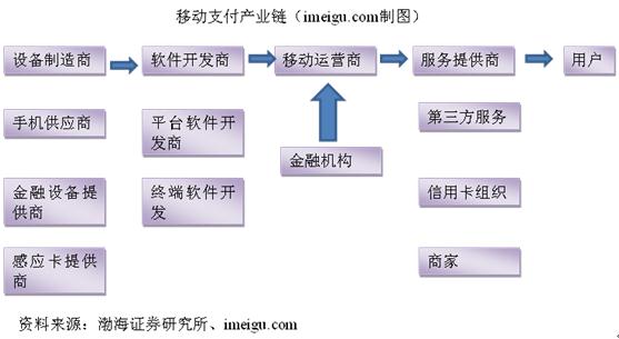 移動支付業(yè)務(wù)產(chǎn)業(yè)鏈主體由設(shè)備制造商、銀行、信用卡組織、移動運營商、移動支付服務(wù)提供商(或移動支付平臺運營商)、商業(yè)機構(gòu)、SIM卡供應商、手機供應商、用戶等多個環(huán)節(jié)組成。
