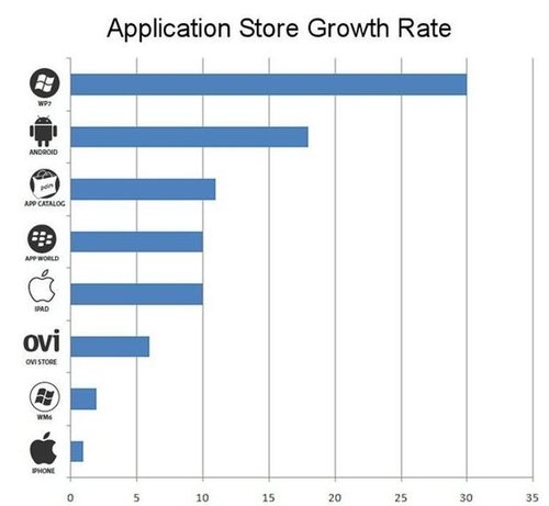 蘋果的iPhone應(yīng)用則只增長了1%。從絕對(duì)數(shù)量上看,iPhone和Android已經(jīng)占據(jù)了絕對(duì)領(lǐng)先的地位。由于應(yīng)用數(shù)量基數(shù)較小,因此WP7可以較為輕易地拿下高增長率,以下是圖表: