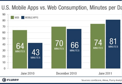Flurry發(fā)現(xiàn)平均每用戶花在移動應(yīng)用上的時間比網(wǎng)絡(luò)多出9%。僅在1年前,用戶平均每天在應(yīng)用上花費43分鐘,在網(wǎng)絡(luò)上花費64分鐘。而現(xiàn)在,用戶在應(yīng)用上的時間增至81分鐘,增幅達(dá)91%。原因為用戶使用的應(yīng)用類型和數(shù)量增加,而非平均時長有大幅增加;ㄔ诰W(wǎng)絡(luò)上的時間增速較緩,目前為74分鐘,同比增長16%。