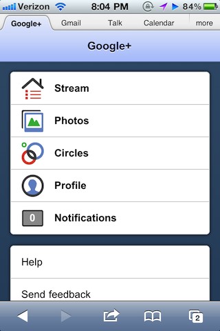Google+移動(dòng)Web應(yīng)用幾乎實(shí)現(xiàn)了與Safari瀏覽器的完美兼容。只要用iOS Safari瀏覽器向plus.google.com網(wǎng)站發(fā)一封郵件,用戶就會(huì)收到一個(gè)用HTML5編寫的Web應(yīng)用。雖然用戶用它無法像Huddle(群聊工具)等原生應(yīng)用(native app)那樣做到無所不能,但Google+的主要功能都在里面。Stream、Photos、Circles、Profile和Notifications均出現(xiàn)在主菜單。