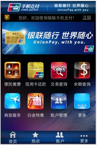 圖:銀聯(lián)手機(jī)支付客戶端軟件主菜單