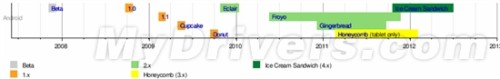 從紙杯蛋糕Cupcake(Android 1.5)開始,隨后是甜甜圈Donut(Android 1.6),松餅Eclair(Android 2.0/2.1),凍酸奶Froyo(Android 2.2),姜餅Gingerbread(Android 2.3),蜂巢Honeycomb(Android 3.0/3.1/3.2),冰激凌三明治Ice Cream Sandwich(Android 4.0)。而即將到來的Android則會是則會是果凍豆(Jelly Bean)。