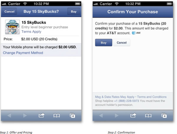 現(xiàn)在,針對應(yīng)用內(nèi)支付,F(xiàn)acebook聯(lián)合移動運營商推出了便捷的支付服務(wù),允許用戶在購買Facebook應(yīng)用開發(fā)商所提供的服務(wù)、游戲或者升級服務(wù)時,直接將交易費記到電話賬單當(dāng)中。整個流程被簡化成2步:首先用戶選擇需要購買的服務(wù),然后打開支付窗口,點擊確認(rèn)即可。