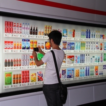 這種虛擬商店消費(fèi)模式如今正漂洋過(guò)海而來(lái),北京移動(dòng)此前就曾推出過(guò)麥當(dāng)勞電子兌換單服務(wù),用戶可以通過(guò)短信接收二維碼,再去麥當(dāng)勞門店掃描兌現(xiàn)。而細(xì)心的申城用戶如今也能在軌交過(guò)道中發(fā)現(xiàn)這樣的虛擬百貨商店廣告,這些燈箱廣告中出現(xiàn)了超市中才能見(jiàn)到的商品貨架,五顏六色的商品圖案讓人仿佛置身于大型超市一樣,但只有當(dāng)你走近才會(huì)發(fā)現(xiàn)“貨架”竟然是“貼”在墻上的,從零食到衣服,甚至還有尿片,這里每一種產(chǎn)品下方都有相應(yīng)價(jià)格和二維碼。