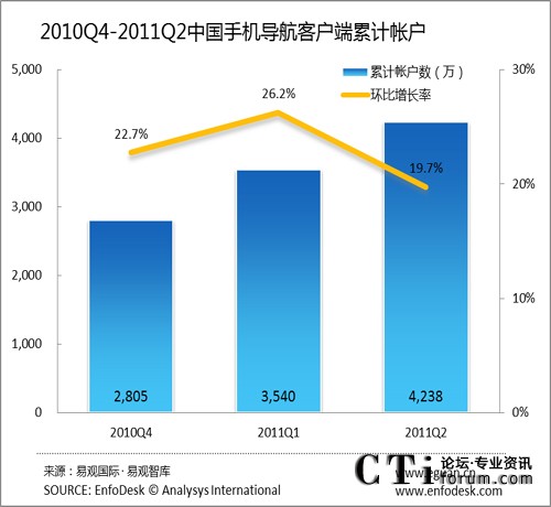 2011年Q2中國手機導(dǎo)航客戶端累計帳戶達4238萬