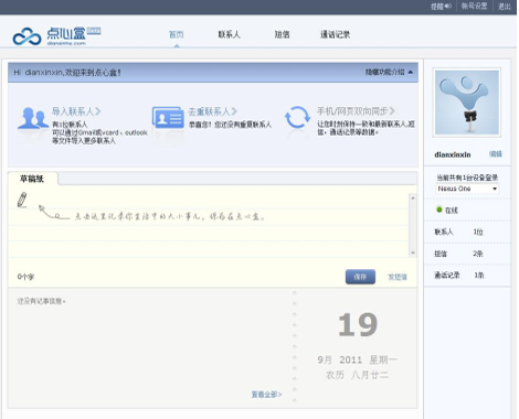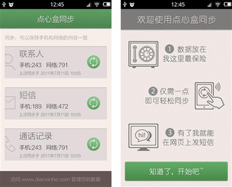 點心盒同步使用十分方便,在手機上安裝客戶端,通過注冊獲取賬號,登陸后進入軟件的主界面,僅需輕點同步按鈕,即可將聯(lián)系人、短信和通話記錄同步到點心盒網(wǎng)站上。此時,不僅在手機端,用戶在云端通過點心盒網(wǎng)站也可以進行聯(lián)系人新建、編輯和刪除的操作,并支持聯(lián)系人導入和去除重復(fù)的聯(lián)系人,方便聯(lián)系人管理。