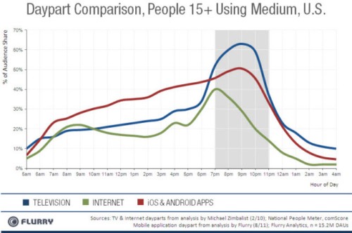 根據(jù)這項(xiàng)研究,用戶一般在下午3點(diǎn)至晚上10點(diǎn)間使用移動應(yīng)用,在晚上7點(diǎn)達(dá)到應(yīng)用的頂峰使用期。相比之下,電視的黃金收視時段在晚上7點(diǎn)至晚上11點(diǎn)之間,互聯(lián)網(wǎng)的使用高峰期在下午3點(diǎn)至晚上11點(diǎn)之間。從早晨6點(diǎn)至晚上6點(diǎn),移動應(yīng)用的使用率超過電視收視率和互聯(lián)網(wǎng)使用率,從晚上9點(diǎn)以后,移動應(yīng)用的使用率開始明顯下滑。