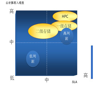 從企業(yè)戰(zhàn)略咨詢分析師的角度,我認(rèn)為IBM的戰(zhàn)略布局和資源整合策略確實是IT領(lǐng)域戰(zhàn)略規(guī)劃很好的教科書(起碼對于我個人而言)。精準(zhǔn)的定位市場、以具有明顯技術(shù)細分優(yōu)勢的產(chǎn)品或服務(wù)切入市場、設(shè)定較高的技術(shù)準(zhǔn)入門檻,這些戰(zhàn)略舉措不僅有助于IBM快速占領(lǐng)新生市場戰(zhàn)略制高點,同時保證了其可持續(xù)競爭優(yōu)勢和利潤空間。從下面的云計算準(zhǔn)入/云服務(wù)SLA象限圖上,當(dāng)很多廠商還在考慮“哪塊云彩有雨”時,IBM已經(jīng)完成在云端提供HPC和高增值二級存儲服務(wù)的布局,掌控了利潤最豐厚的云計算高端市場。從我個人的預(yù)測,IBM在云端提供一級存儲服務(wù),應(yīng)該是其云計算高端戰(zhàn)略的下一個布局。