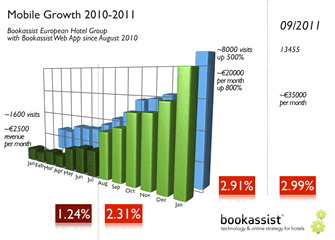 圖表1顯示了一座歐洲小城的一家城市酒店集團自2010年以來的移動業(yè)務發(fā)展趨勢。這家酒店集團到2010年底才推出移動優(yōu)化的網(wǎng)站,但從2010年8月份起采用了我們的移動解決方案。