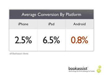 當你看到以下數(shù)據(jù)時,會覺得很有趣,Android用戶帶來的轉(zhuǎn)化率遠低于平均水平,僅為0.8%;iPhone用戶帶來的轉(zhuǎn)化率是Android的3倍,為2.5%;而iPad用戶帶來的轉(zhuǎn)化率是Android的8倍,為6.5%。iPad帶來的轉(zhuǎn)化率出奇的高,體現(xiàn)了消費者使用iPad的熱情。所以酒店經(jīng)營者應該優(yōu)先考慮此平臺,確保他們的網(wǎng)站都針對iPad進行了優(yōu)化。