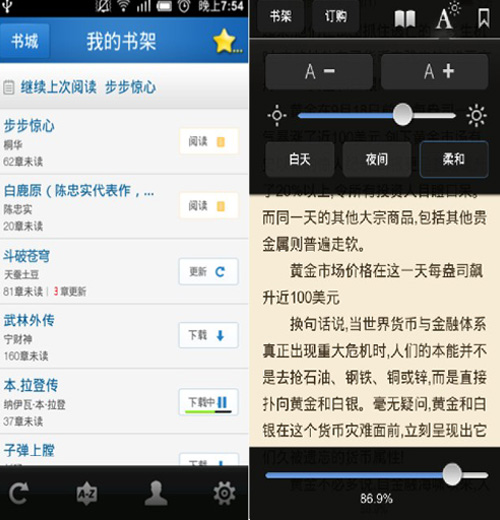 鑒于Android版和iOS版應(yīng)用功能和界面相差不大,我們就說說Android版本。整個應(yīng)用主要分為三大部分:書架、閱讀和書城。