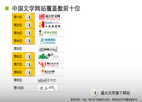 根據(jù)艾瑞咨詢的數(shù)據(jù),中國文學(xué)網(wǎng)站覆蓋人數(shù)最多的前8個文學(xué)網(wǎng)站中,盛大旗下文學(xué)網(wǎng)站占了7個,包括排名第一的起點中文網(wǎng)等。