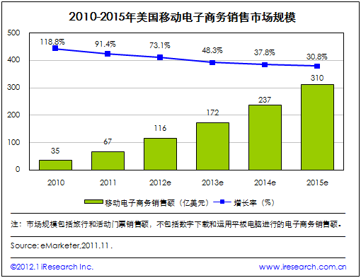 艾瑞咨詢根據(jù)整理eMarketer研究數(shù)據(jù)發(fā)現(xiàn),2011年美國移動(dòng)電子商務(wù)零售市場規(guī)模達(dá)到67億美元,相比2010年增長率高達(dá)91.4%,強(qiáng)勁的增長勢頭預(yù)計(jì)將一直持續(xù)到2015年,移動(dòng)電子商務(wù)市場銷售額將達(dá)到310億美元。