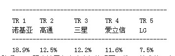 第一階段;湯森路透將每一項專利同歐洲電信標準協(xié)會截至2011年11月18日的LTE規(guī)范進行比較,確定專利的重要性。第二階段涉及先有技術(shù)檢查,即審查在美國和歐洲申請專利過程中的先有技術(shù)參考文獻。湯森路透利用先有技術(shù)參考文獻評估每項專利的新穎性并給出新穎性評級。湯森路透發(fā)現(xiàn),擁有屬于LTE標準范疇的基本與新穎專利的領(lǐng)先廠商有諾基亞、高通、三星、愛立信和LG。結(jié)果如下: