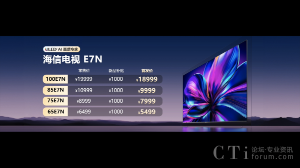 海信AI電視E7N提供了65/75/85/100吋四個版本,零售價分別是6499元、8999元、10999元、19999元,首發(fā)享受體驗金1000元,到手價5499元、7999元、9999元、18999元,9月29日0點(diǎn)正式開售;同時享受3000元政企雙補(bǔ)(2000元1級能效政府至高補(bǔ)貼+1000元企業(yè)至高補(bǔ)貼),以及6000元套購補(bǔ)貼(海信品質(zhì)家電全套購,滿額至高再補(bǔ)貼6000元)。