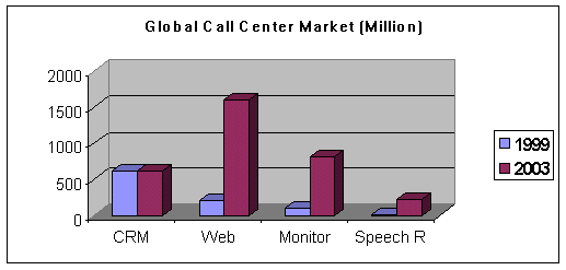 。。在1999年,全球呼叫中心應(yīng)用軟件的市場總值為29億美元,到2003年這一數(shù)字將增長近三倍,達(dá)到85億美元。這一增長主要來源于對基于互聯(lián)網(wǎng)呼叫應(yīng)用軟件以及呼叫監(jiān)控解決方案的需求。Data-monitor 市場分析專家在1999年針對呼叫中心軟件市場進(jìn)行調(diào)研,具體數(shù)字詳見下表: