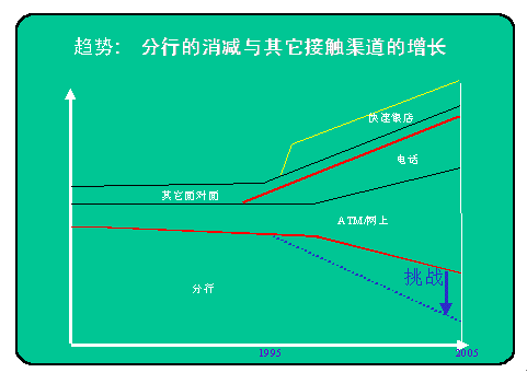 。。下圖為國外專家對銀行不同客戶服務(wù)渠道發(fā)展比例的說明?梢钥吹剑瑺I業(yè)廳的比例在逐年下降,而國外不少銀行甚至將進(jìn)一步壓縮營業(yè)廳比例作為一項渠道的任務(wù)。電話銀行也就是通過IVR實現(xiàn)的自助服務(wù),自然是呼叫中心的一部分,但人工服務(wù),包括對上網(wǎng)及其它互動方式的客戶提供的座席代表服務(wù),當(dāng)然更是現(xiàn)代呼叫中心業(yè)務(wù)的一部分,圖上雙紅線內(nèi)所表示的正是不斷發(fā)展的呼叫中心的所占比例。