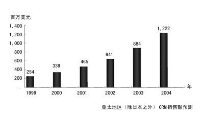亞太地區(qū)正在成為CRM應(yīng)用軟件的新興市場。1999年亞太地區(qū)CRM市場的年增長率達(dá)33.5%。其中中國CRM市場是除日本外最具發(fā)展?jié)摿Φ氖袌觥nA(yù)計(jì)到2004年,中國CRM市場的復(fù)合年平均增長率為60%。