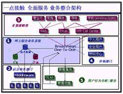 在“一對一模式”中,BroadVision公司可以為原有后臺系統(tǒng)提供有機的整合(如連接用戶的記費、業(yè)務、用戶數(shù)據系統(tǒng)),使其在前臺可提供多種用戶的接入手段,形成業(yè)務的完整流程,如通過多種接入手段提供查詢、咨詢、受理、投訴等業(yè)務;電信企業(yè)還可通過此平臺提供增值業(yè)務,如電子商務、信息服務、代繳費等。