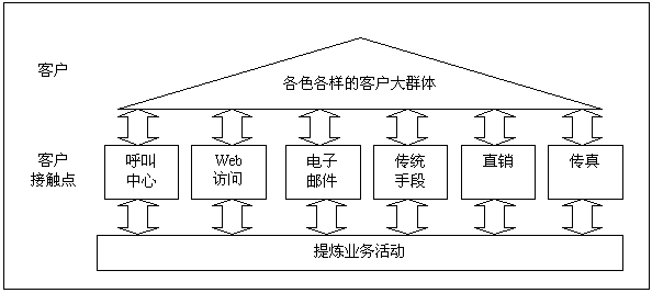 運營型CRM,也著稱為“前臺”CRM,與客戶直接發(fā)生接觸。我們將這些交互作用看成客戶“接觸點”。接觸點可以是“入境”接觸,例如,打給公司客戶熱線的電話;也可以是“出境”接觸,例如,一對一銷售電話或e-mail促銷。如今市場上自稱為CRM供應商的產品主要歸入運營類。圖1解釋了不同層次的運營型CRM。