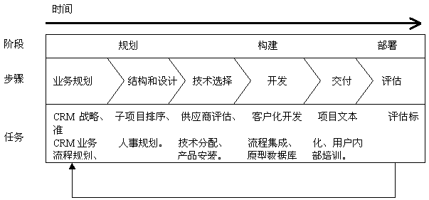 CRM規(guī)劃圖包括三個(gè)主要的項(xiàng)目開發(fā)階段:規(guī)劃、構(gòu)建、部署;它還以“分布驟”為特色,包括許多固定的和可變的任務(wù),簡(jiǎn)單介紹如下: