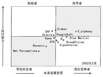 Siebel 和Oracle因?yàn)樵谄銫RM中整合了E-Marketing以及公司強(qiáng)大的資金實(shí)力,因此在挑戰(zhàn)者中最為引人注目。預(yù)計(jì)Siebel 將在6到12個(gè)月內(nèi)進(jìn)入E-Marketing市場(chǎng)的領(lǐng)導(dǎo)者行列。SAP首次出現(xiàn)在這一群體之中,但是它的強(qiáng)項(xiàng)在于其產(chǎn)品易于與已安裝的其它軟件相集成,而不是其E-Marketing的功能,這一點(diǎn)限制了那些沒有購(gòu)買過(guò)SAP產(chǎn)品的企業(yè)接受其產(chǎn)品。