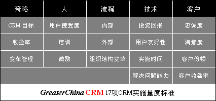 GreaterChinaCRM提出了一組量度標(biāo)準(zhǔn)(五個范圍共17項(xiàng)),不僅覆蓋了軟件/技術(shù)方面的回報,也綜合包括了策略,人,流程,技術(shù)和客戶。這些量度標(biāo)準(zhǔn)告訴我們應(yīng)當(dāng)如何看待和評估CRM的實(shí)施。讓我們來看一下: